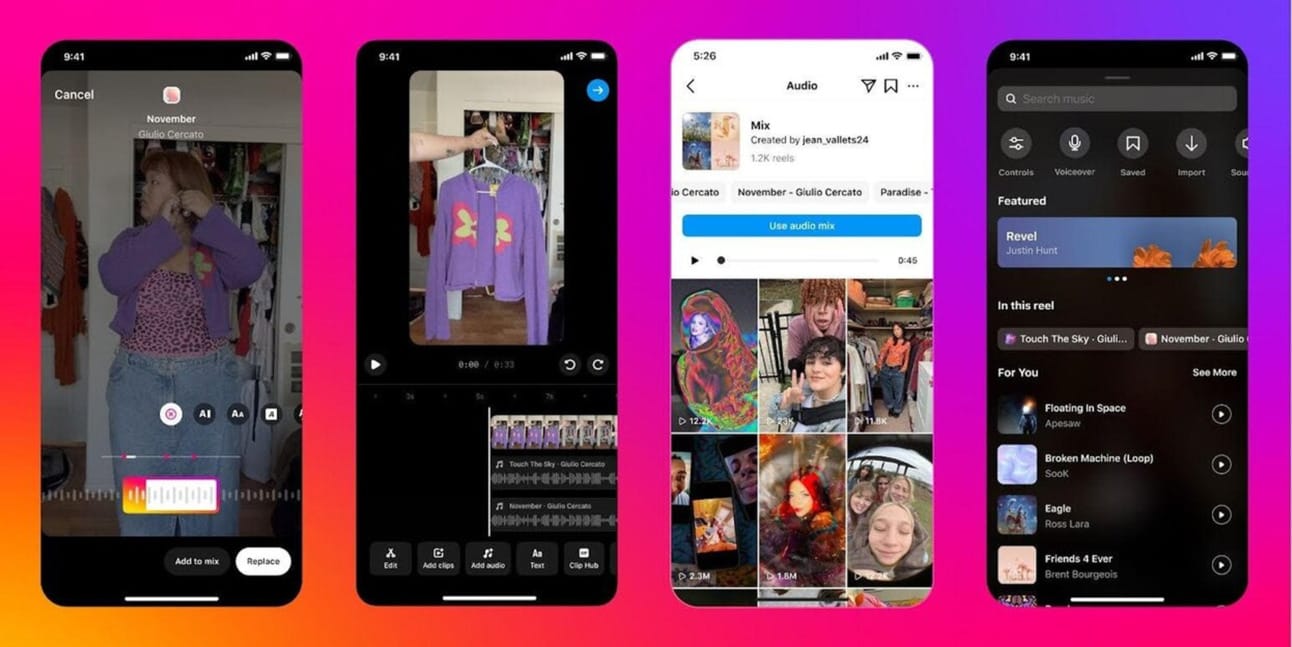 Instagram rolled out Multitrack Audio in Reels. This feature allows creators to add up to 20 songs or clips to their videos and visually align audio with elements like text, stickers, and clips during editing. Creators' unique mixes will be attributed to them and can be saved and reused by others.