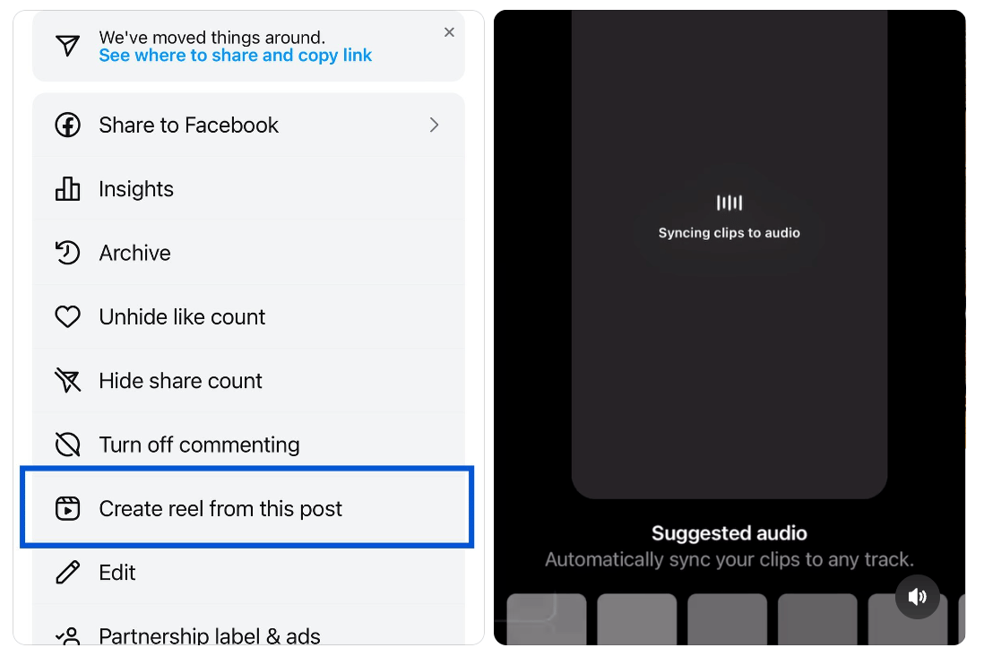 Instagram now lets users turn Carousel posts into Reels. Accessible via the three dots at the top right of a post, this feature automatically syncs the photos and videos in the Carousel with recommended audio and sequencing. Users can make edits as needed before publishing.