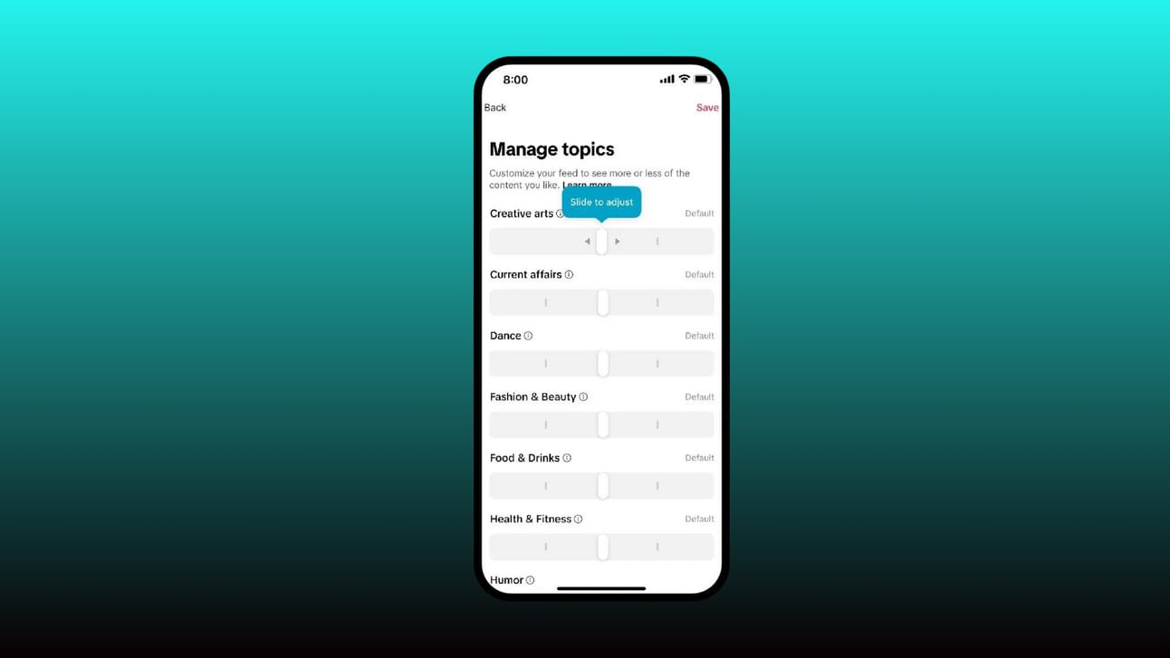 TikTok launched a Manage Topics feature. U.S. users can now customize their For You feed by using a slider to adjust preferences across various topics, allowing them to see more or less of specific content.