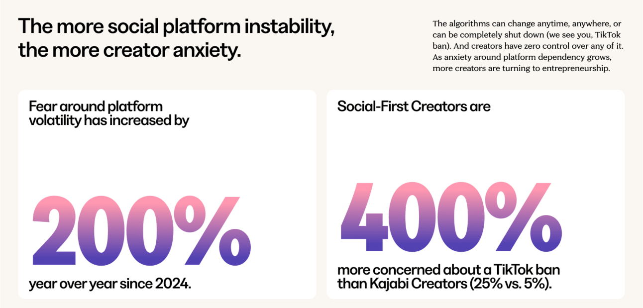 Kajabi’s report found that fear around platform volatility has surged 200% year-over-year among Social-First Creators, whose income depends heavily on brand deals, ad revenue, and affiliate commissions.