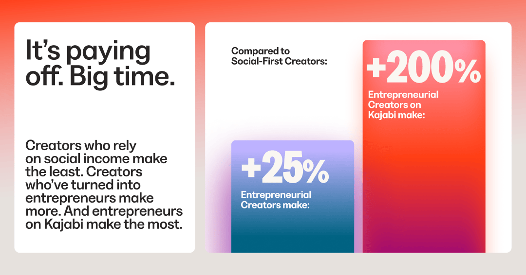 This shift isn’t just about chasing new trends. It’s about regaining control. Creators who diversify their income into owned channels are seeing meaningful financial and personal benefits. According to the report, Entrepreneurial Creators earn 25% more than Social-First Creators, and creators using Kajabi specifically earn 200% more.