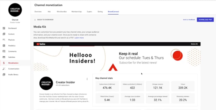 The Media Kit can be downloaded as a PDF for creators to share directly with brands and is discoverable through BrandConnect, YouTube’s in-house influencer marketing platform.
