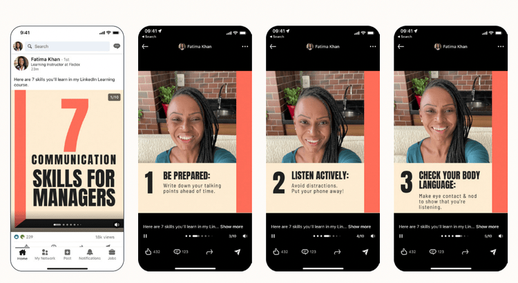 In a recent announcement, LinkedIn introduced Carousels, a new content format that allows creators to share swipeable photos and videos. Users can swipe through the content at their own pace and have the ability to watch Carousels within their feed or tap to view fullscreen on mobile.