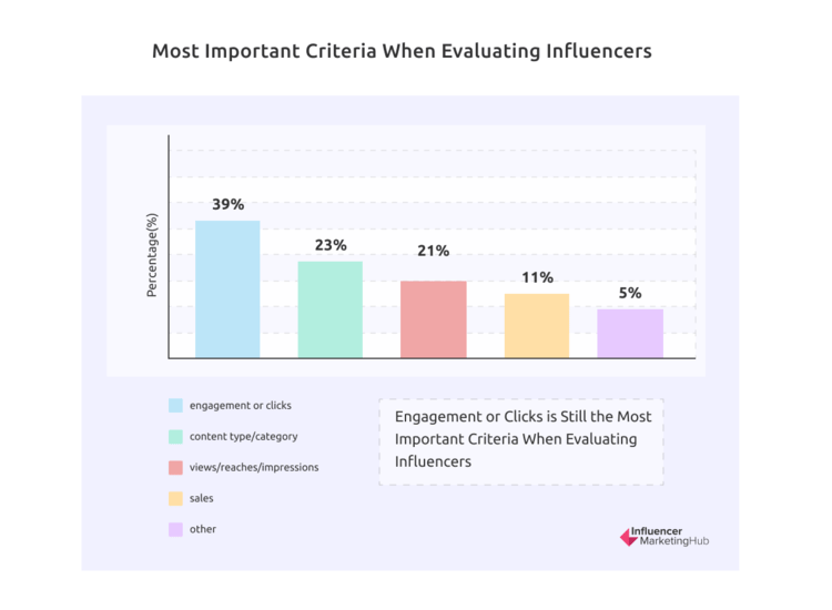 One of the most interesting data points was the criteria that marketers use when evaluating influencers. 39% of respondents said engagement or clicks are most important. This is not too surprising since both are good indicators of whether or not creators and their content resonate with audiences. This is actually similar to the results of last year's report. However, the thing that did change from last year is that more brands see content type/category as more important (23%) than views/reaches/impressions (21%).