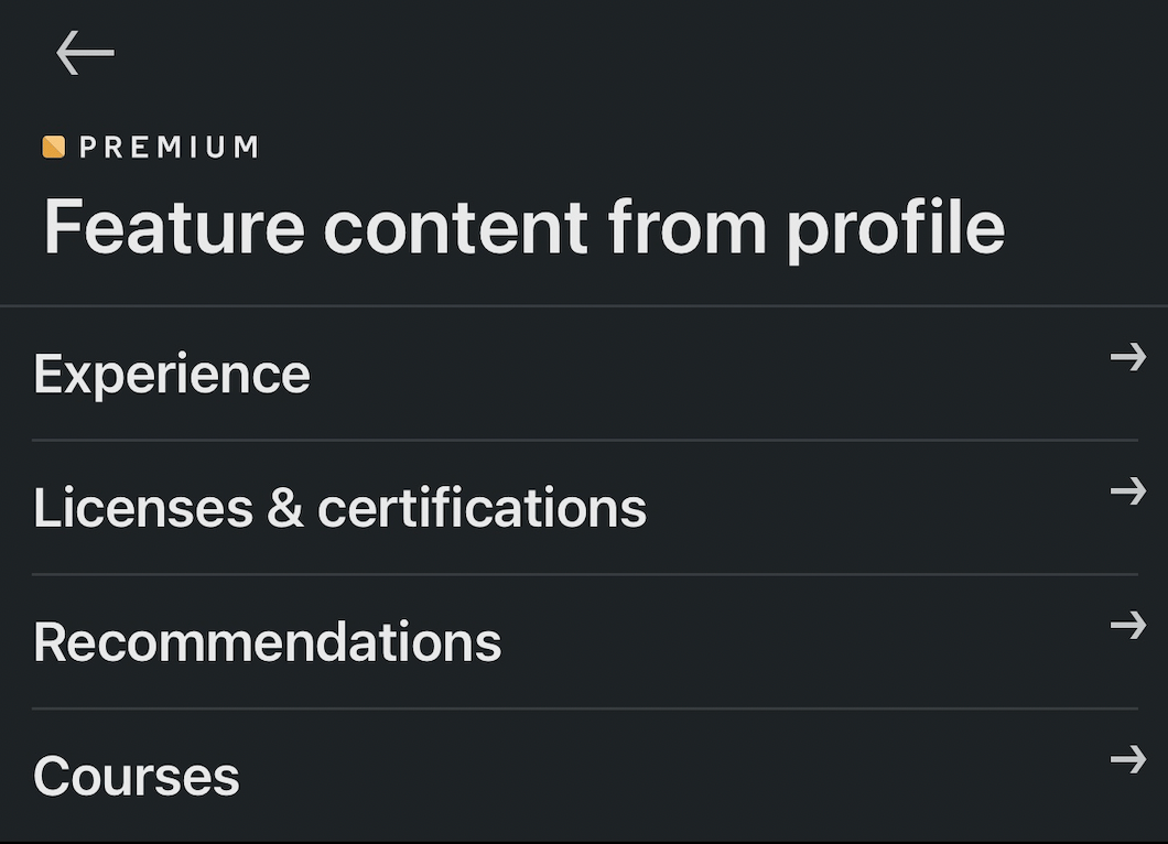 LinkedIn added an option for Premium users to showcase content from their profile in the Featured section. With 'Add Content from Profile,’ users can prominently display profile content such as Experience, Licenses & Certifications, and Recommendations.