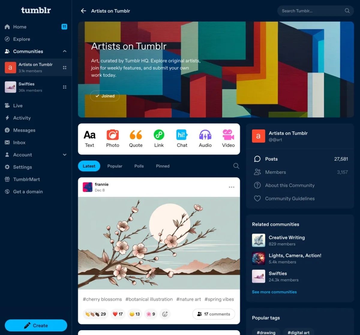 Tumblr has launched Communities, an experimental feature from the Tumblr Labs division. Communities offer users a dedicated space for individuals with shared interests and passions, such as favorite games, movies, hobbies, and much more. Each community has moderators, members, and a separate feed from a user's Following and For You feeds.