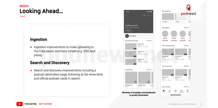 Integration: The platform plans to make it easier and simpler for creators to upload podcasts to YouTube through RSS feeds. It also plans to improve search and discovery through a podcast destination page, following at the show level, and podcast cards in search.