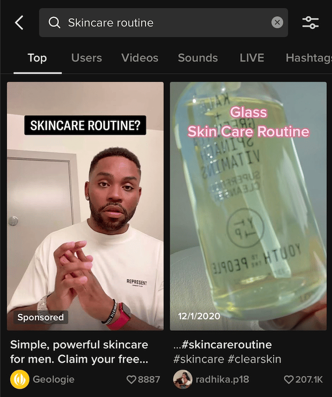 TikTok is currently beta testing Search Ads with select advertisers. Through this option, advertisers can run ads that appear in search based on keywords and terms users search for. Search Ads are labeled "sponsored" and appear at the top of search results.