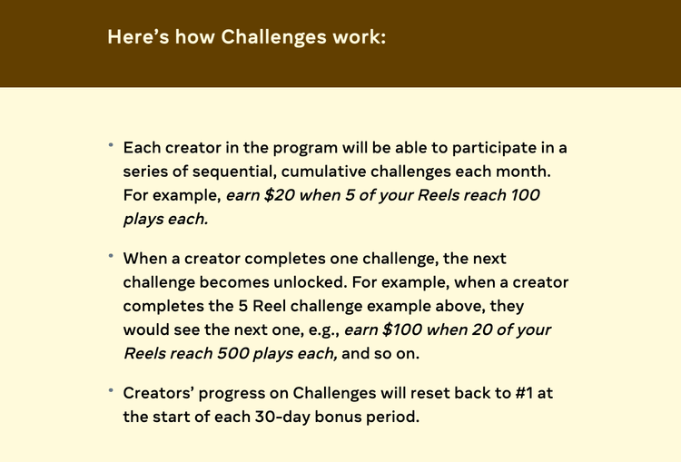 First, it’s making adjustments to how payouts are calculated to reward creators with a range of audience sizes. Second, it's rolling out Challenges on Facebook, a new component of the program where creators can earn money through a series of sequential, cumulative challenges each month. For example, creators can earn $20 when five of their Reels get 100 plays each. After completing a challenge, they unlock another challenge, which pays out more and has a higher view threshold. At the end of each month, creators’ progress on Challenges will reset to the first challenge. Lastly, it shared that it’s giving creators more visibility into how Reels are performing with new insights. Creators can see how many plays each of their eligible Reels have received within a given earning period.