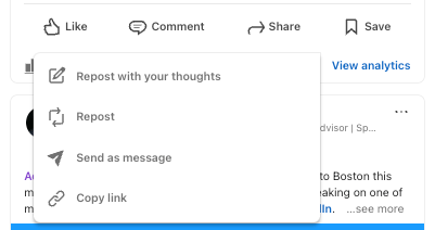 LinkedIn has updated the post menu. While the like and comment buttons remain, the Repost and Send buttons have been replaced with Share and Save buttons. The Share button now includes options for reposting, sending the post as a message, and copying the post URL. The Save button allows users to save posts directly from this menu.