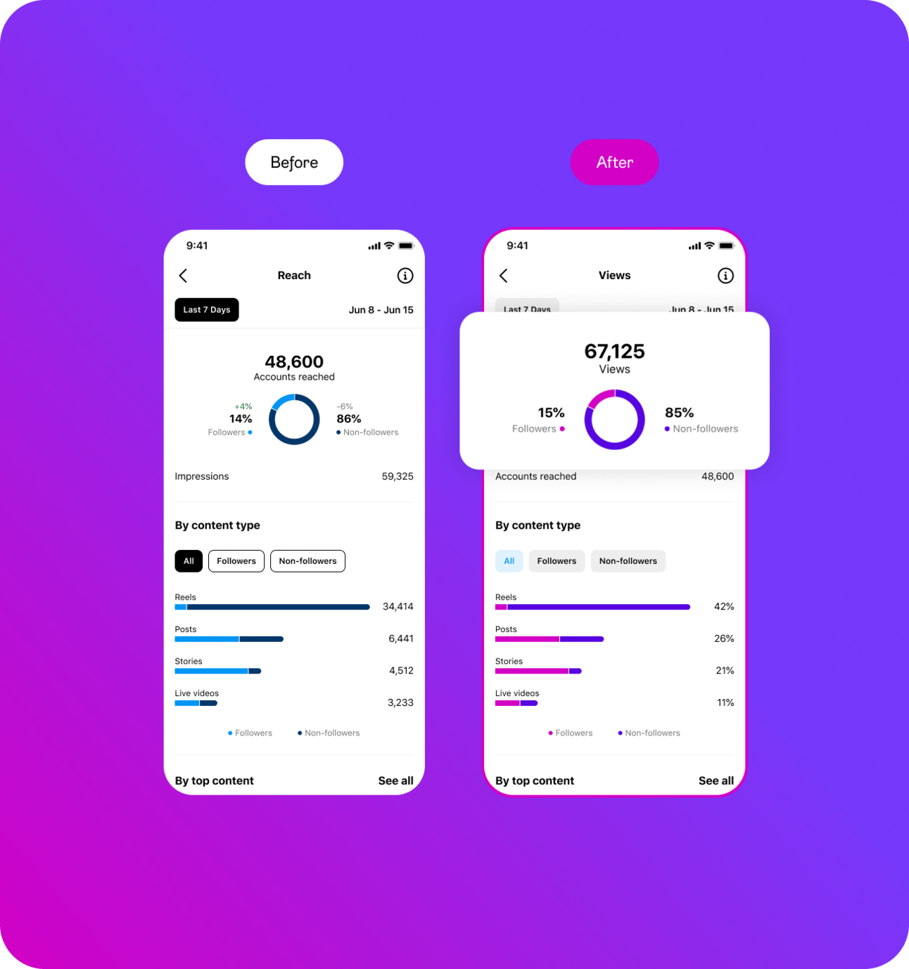 Instagram has announced a big change to Insights: Views will now be the primary metric across all formats—photos, Carousels (which can now be up to 20 photos or videos), Reels, Stories, and Live. This update will apply to both organic and boosted posts featuring these formats.