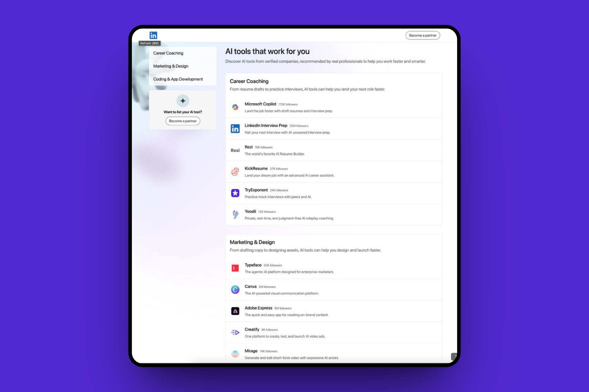 Why It Matters: Members get a trusted, curated list of AI tools to support their work—from job searching and content creation to building solutions. Featured companies gain visibility and a new way to reach LinkedIn’s 1 billion plus members, aligning with LinkedIn’s mission to empower the global workforce.
