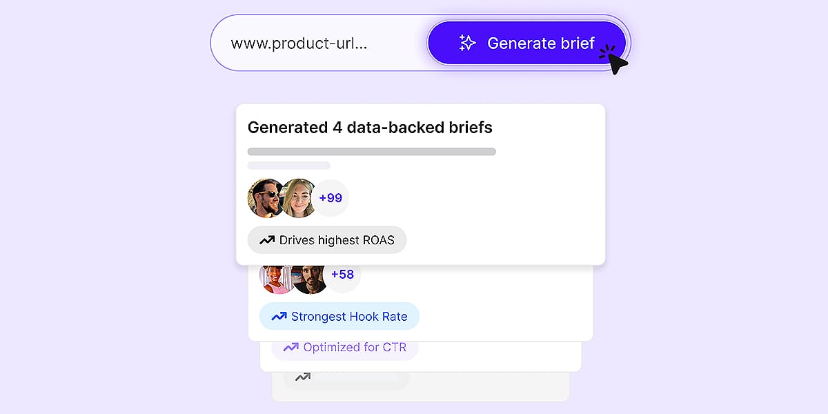 Brief Builder: Enter your product URL to get 4 data-backed brief suggestions for hooks, CTAs, and concepts based on what’s actually driving performance in your category.