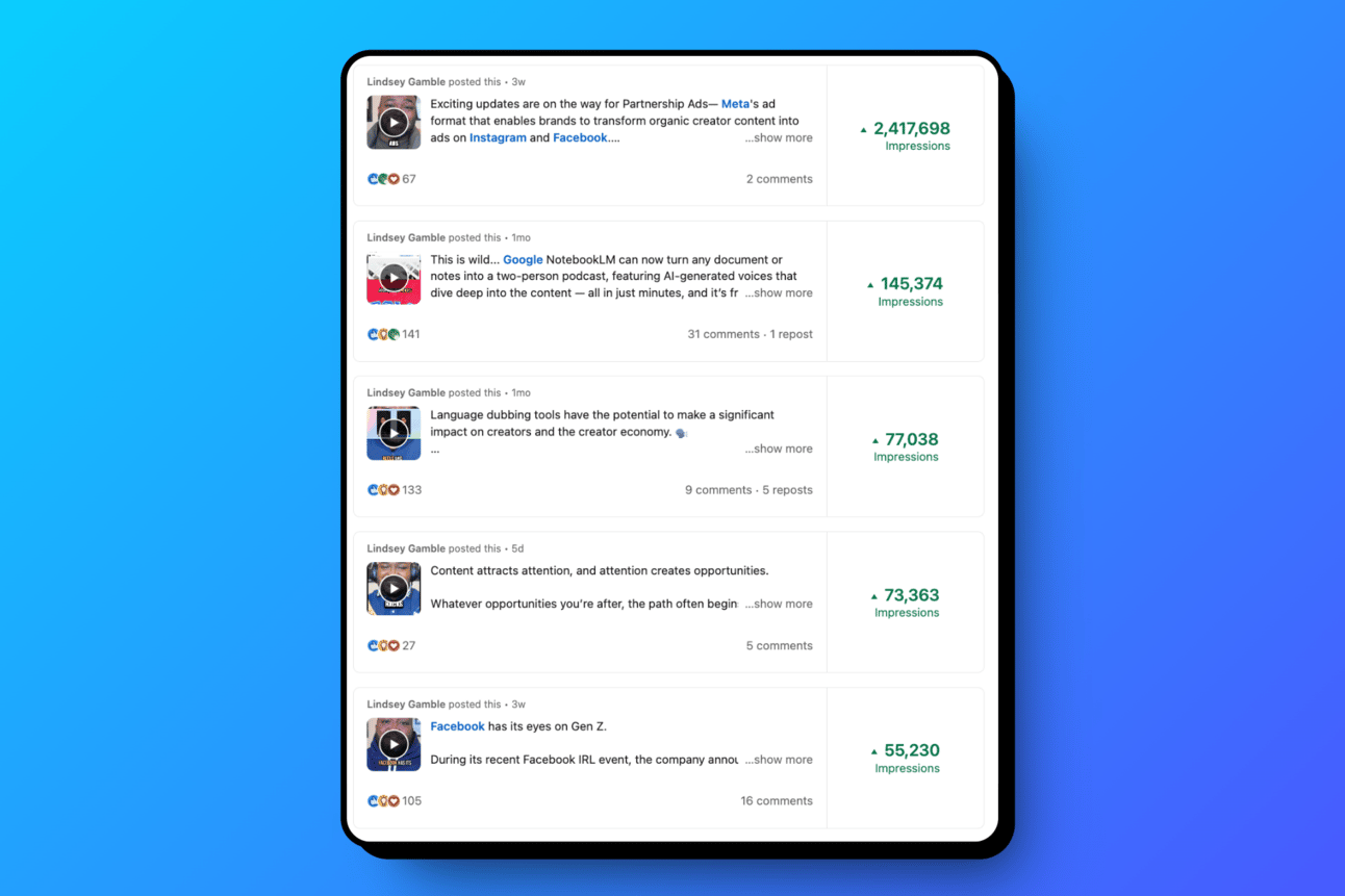 After experiencing a decline in the reach of my text and image posts, I began experimenting with video content. While I have plenty of videos that aren’t performing well, my top posts over the last 90 days have all been videos, including one that hit 2.4 million impressions and surpassed the total impressions on my content from last year. In contrast, my best-performing text and image post during this time reached just under 10,000 impressions. Overall, video content provides an organic reach that’s challenging to achieve with other formats.