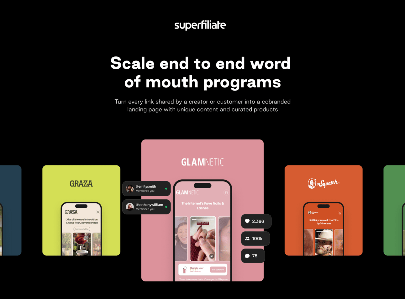 From ambassador, creator, influencer, affiliate, referral, and loyalty programs—Superfiliate lets you do it all. With just the tools you need and nothing you don’t, empower creators and customers through end-to-end word-of-mouth programs with: